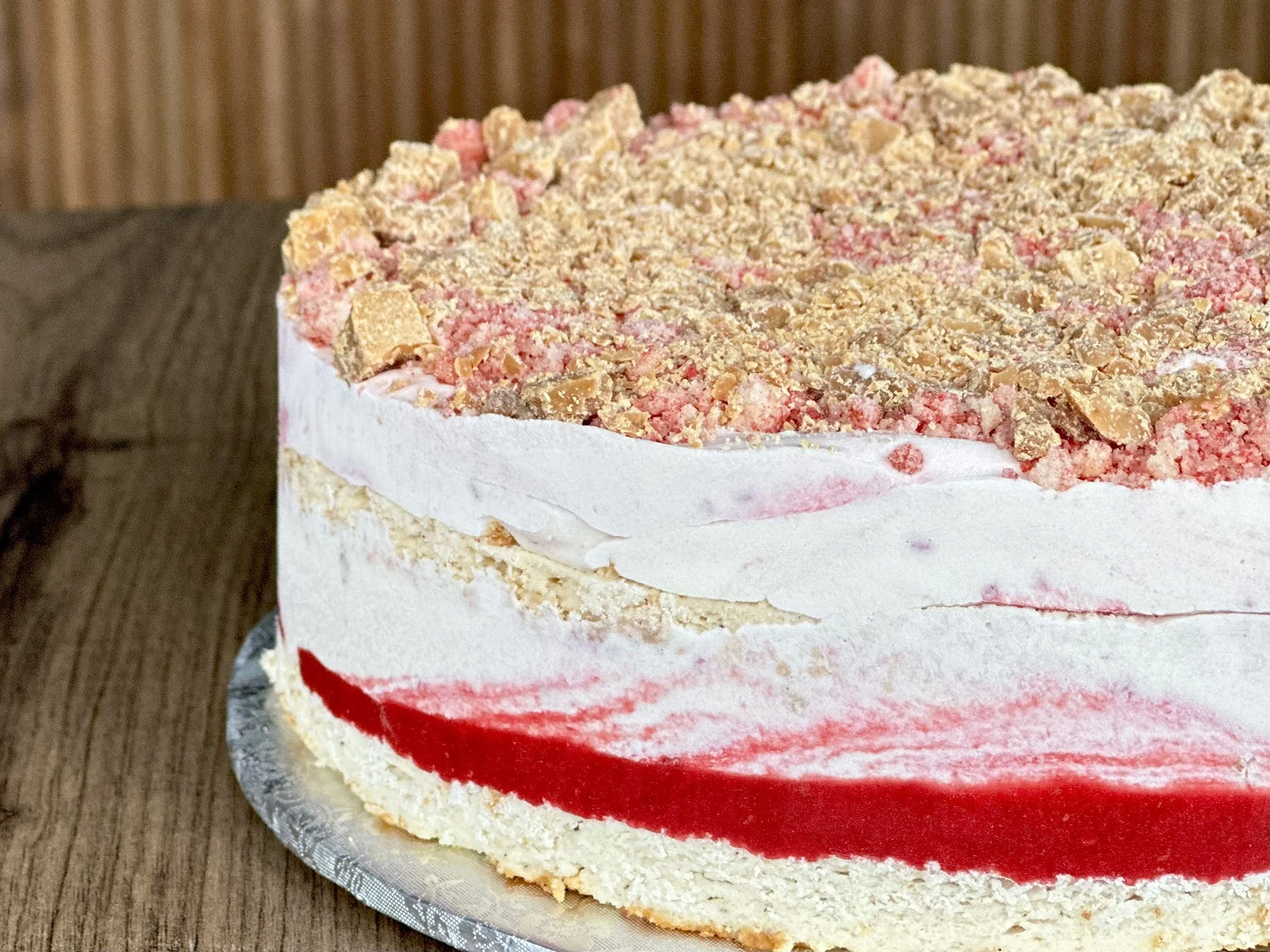 White chocolate roasted until caramelized then broken into small tasty bits, swirled in our sweet cream base with a fresh raspberry ripple